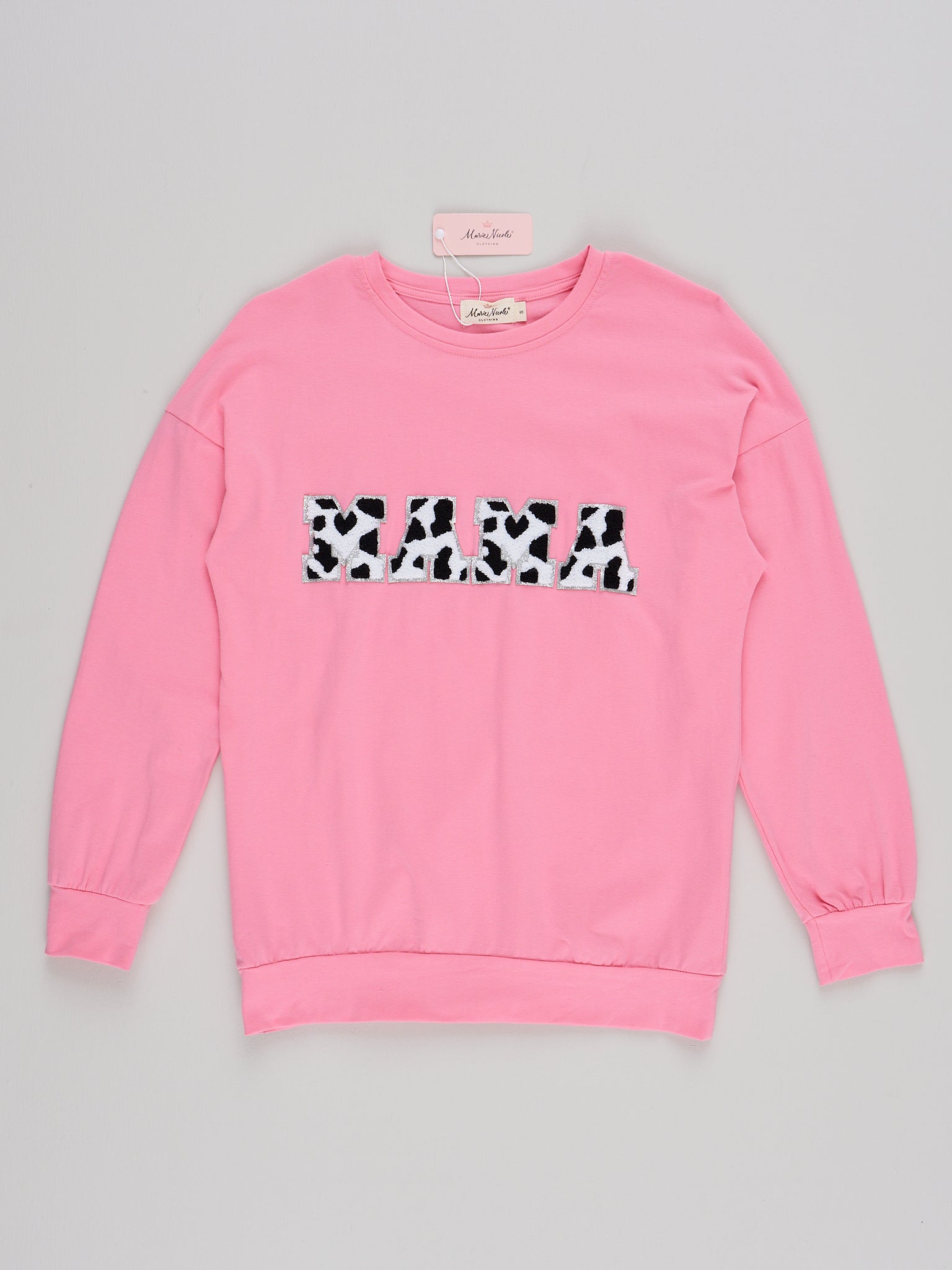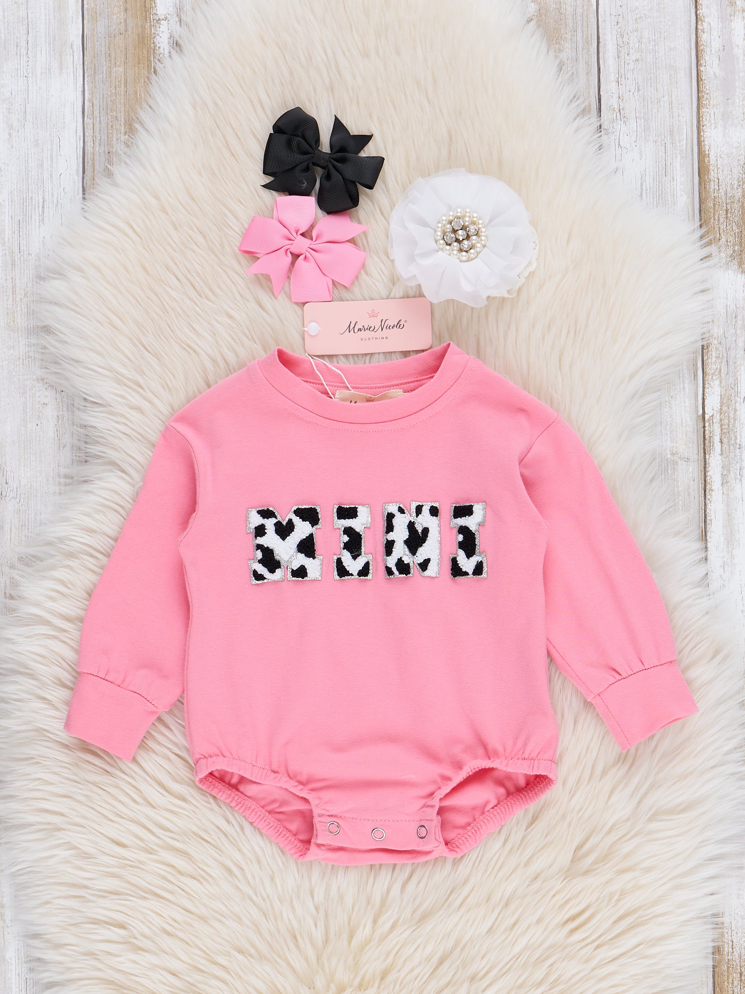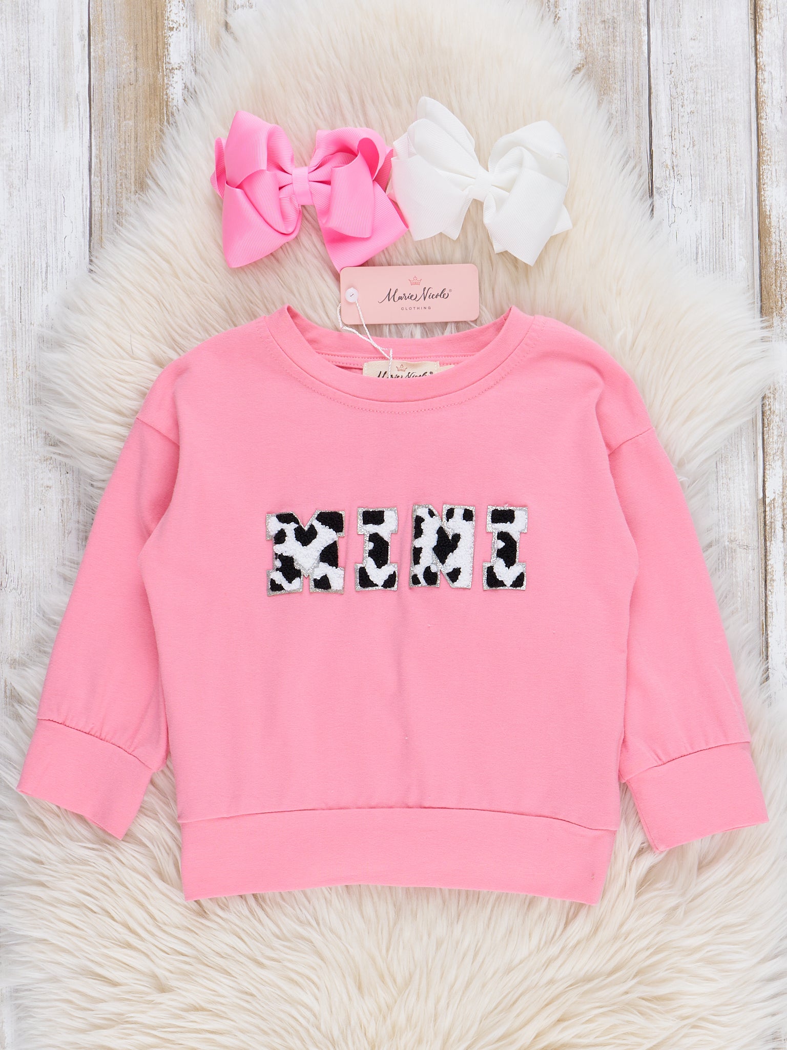 Have a cow, Mama! This playful top features matching "Mama" and "Mini" cow print chenille designs on a pink long sleeve shirt. Perfect for showing off your bond with your little calf while staying cozy. Moo-velous!